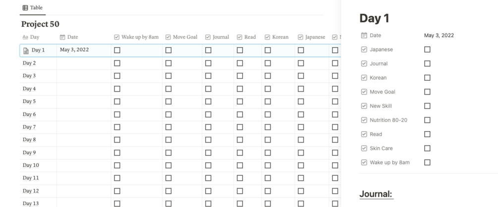 A link to the Project 50 Tracker Notion template, which you can duplicate and customize.